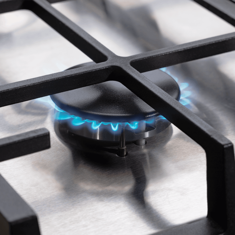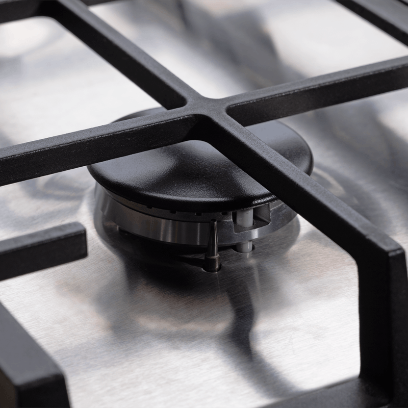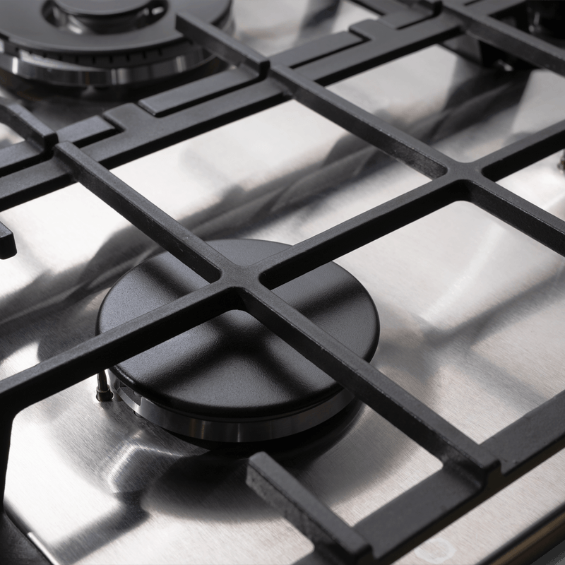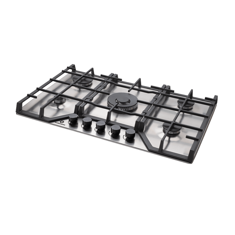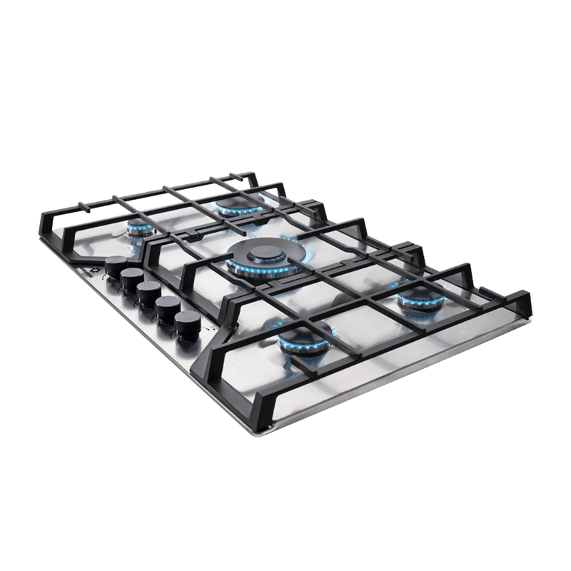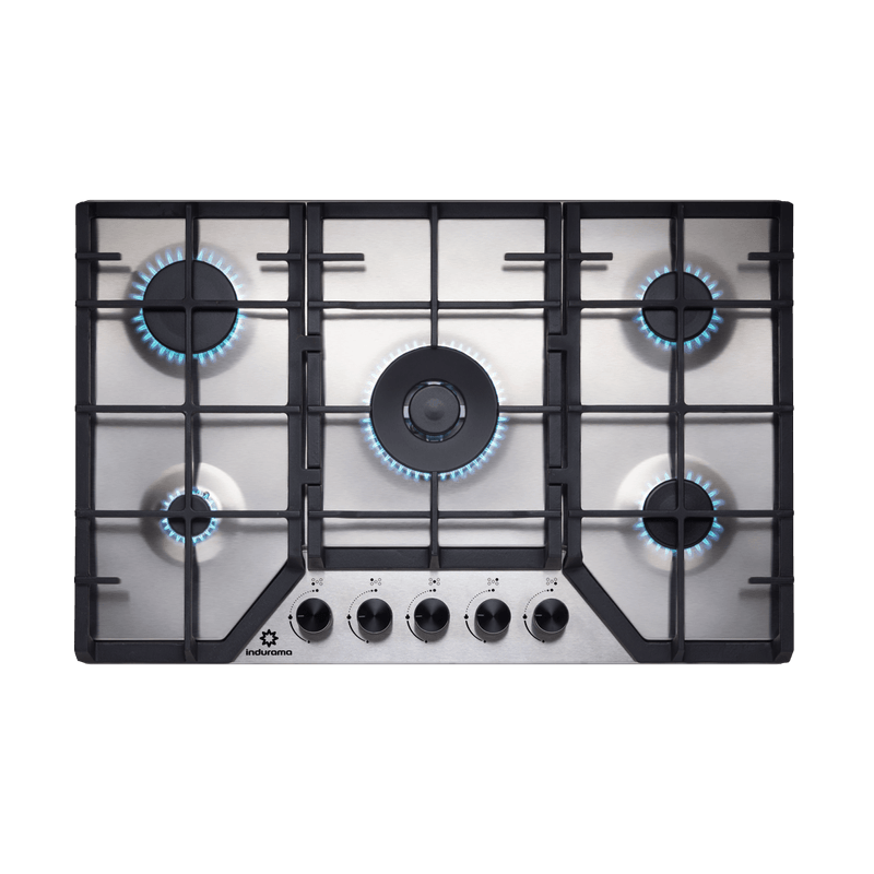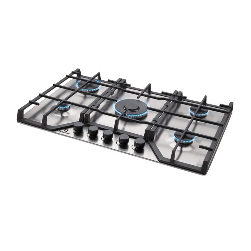 Encimera a Gas, 5 quemadores. Máxima potencia y eficiencia, quemador triple corona ultra-rápido. Tablero de acero inoxidable. Mayor seguridad y confianza en tu hogar, sistema de quemadores sellados con válvulas de seguridad corta-gas. Tecnología italiana.
