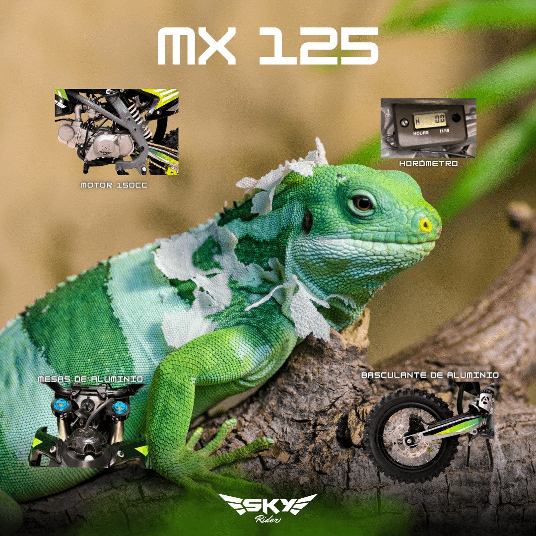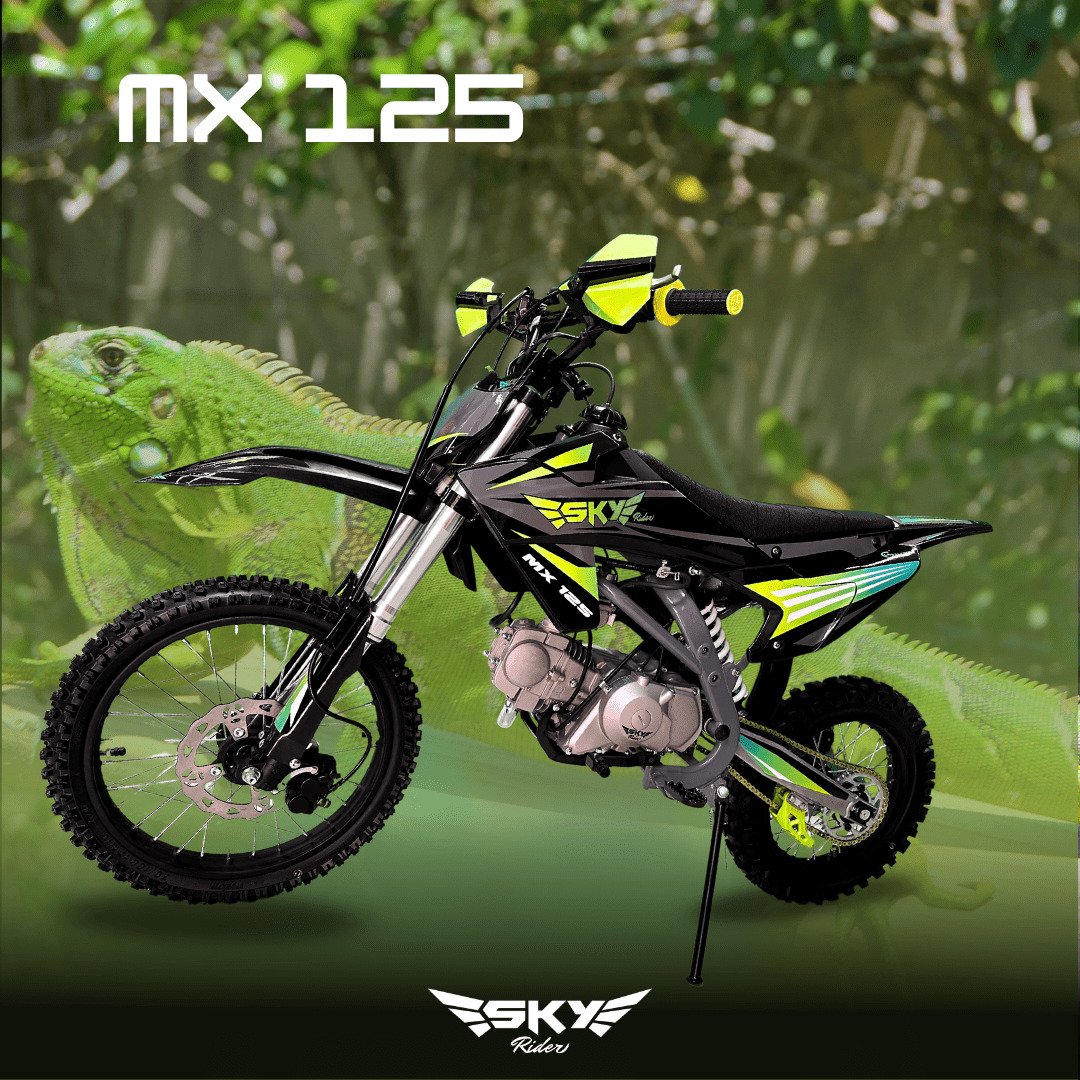 SKY MX 125 Verde – “Se adapta a todo terreno” Ágil, liviana y lista para el desafío. Suspensión invertida, carburador Nibbi, diseño tipo cross con 6 lonas. ¡Inspirada en la iguana verde para dominar todo terreno!