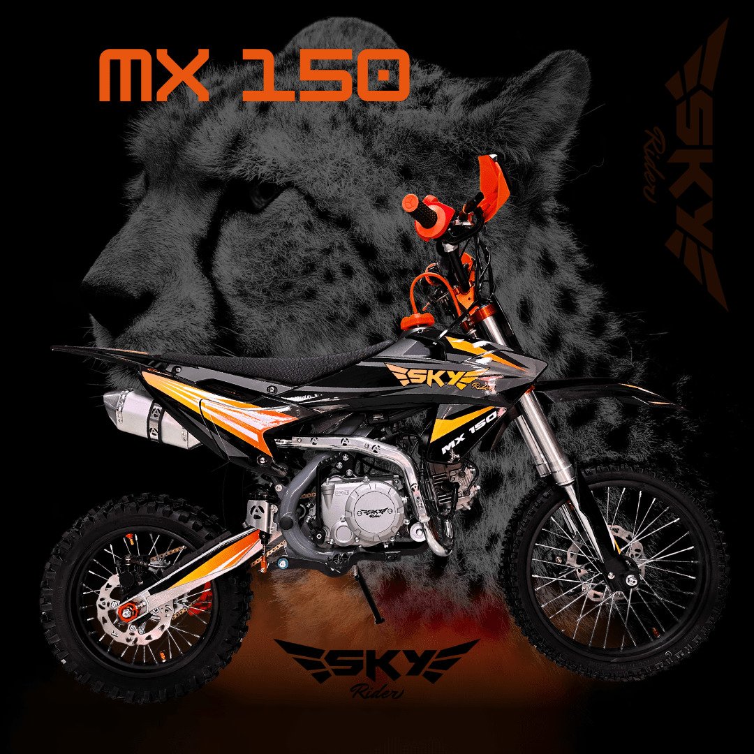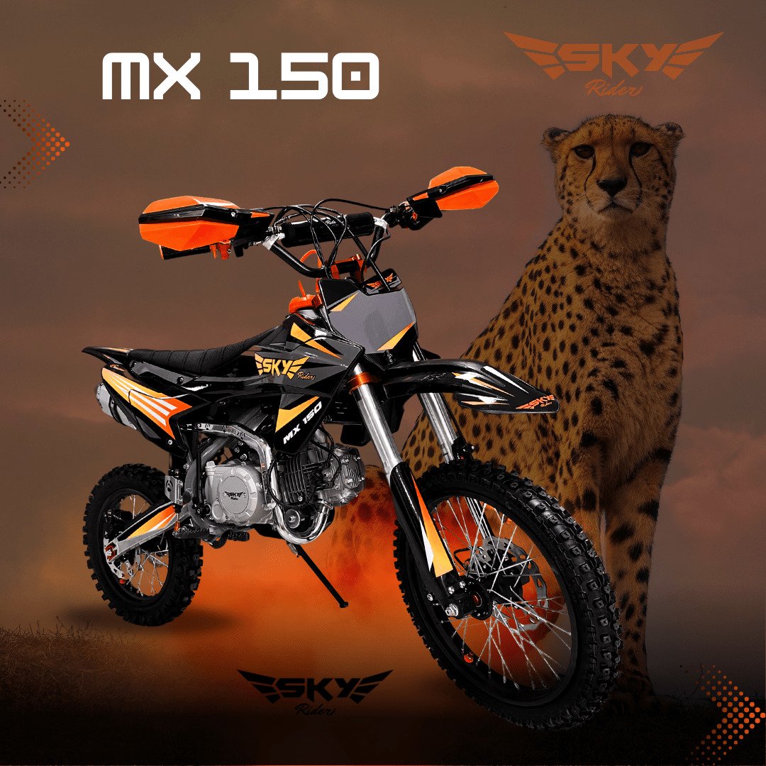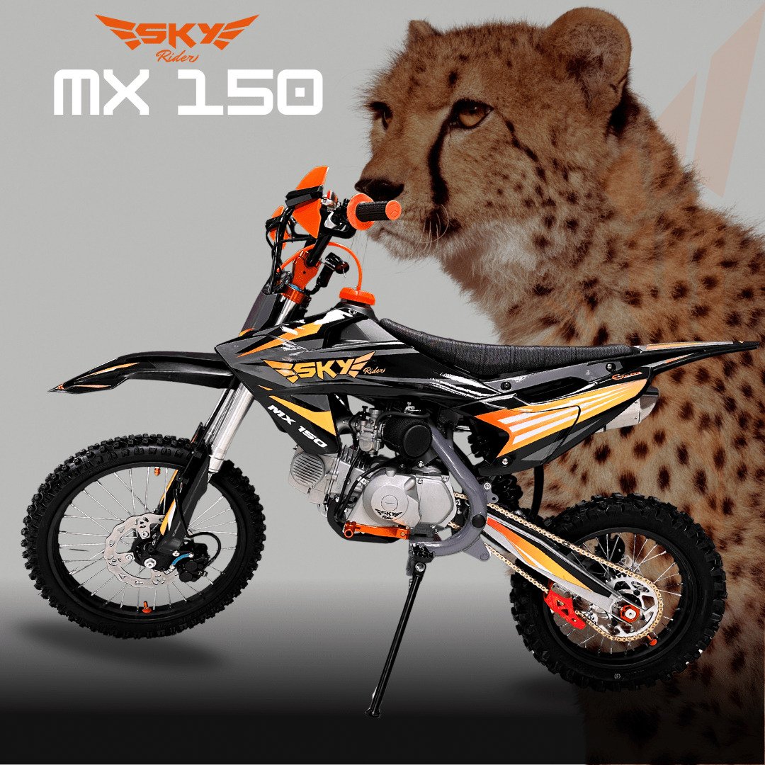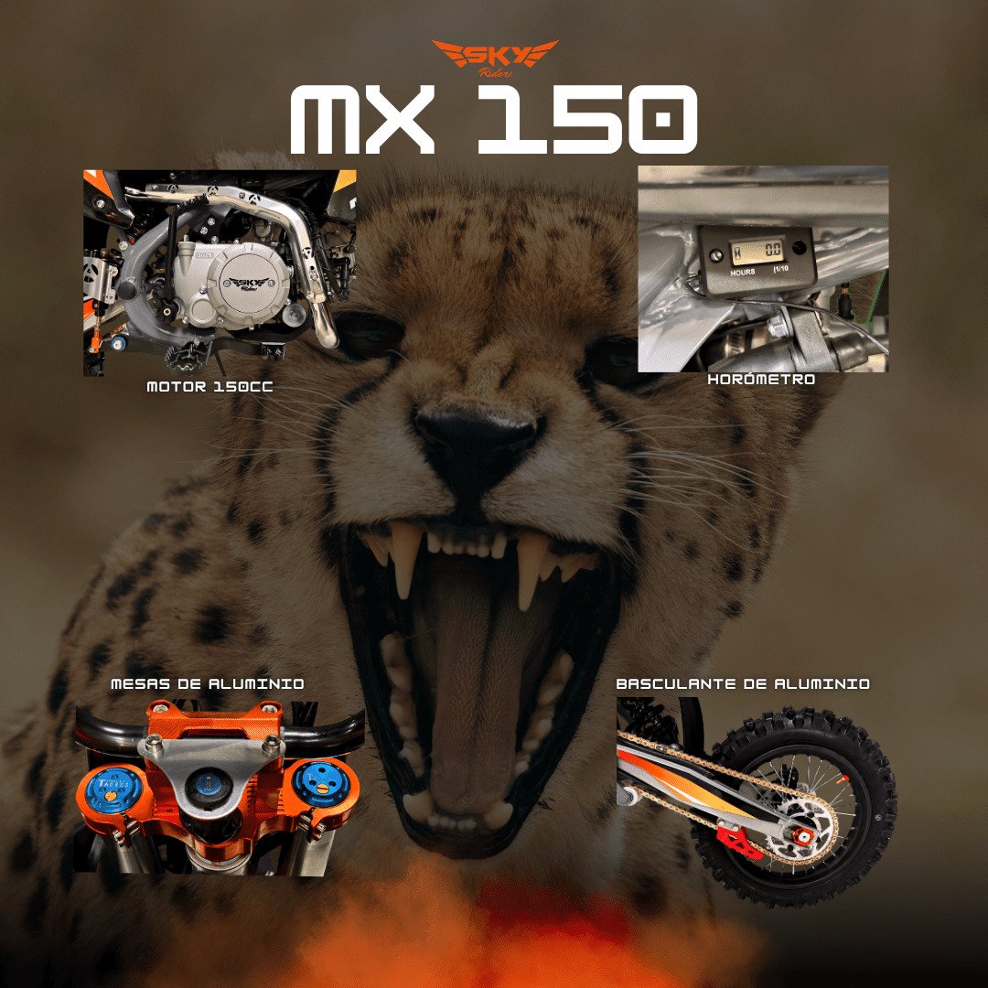 SKY MX 150 – “Corre con la velocidad del guepardo” Motor 150cc con radiador de aceite, suspensión invertida, Nibbi y más torque. Ideal para riders que quieren velocidad, reacción y potencia real.