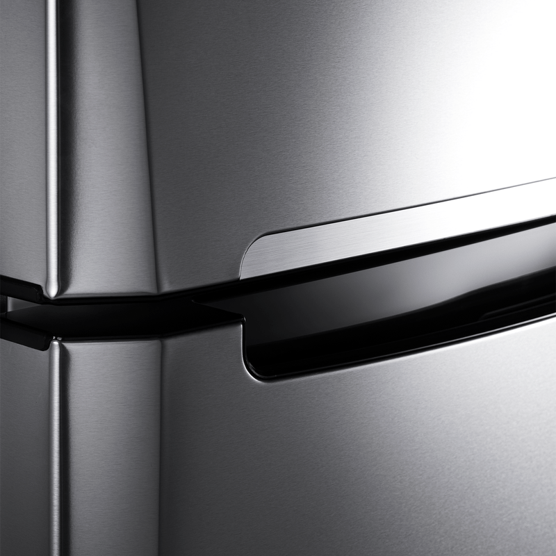 En su estructura externa destaca la lámina inoxidable anti huella, que evita marcas visibles y facilita la limpieza. Las puertas son lisas con manija frontal integrada para una estética moderna y práctica. El compartimiento refrigerador incluye bandejas modulables de vidrio templado, balcones transparentes e iluminación LED que mejora la visibilidad. En el congelador, hay balcones amplios y una bandeja ajustable para adaptarse a tus necesidades. También incluye porta huevos.