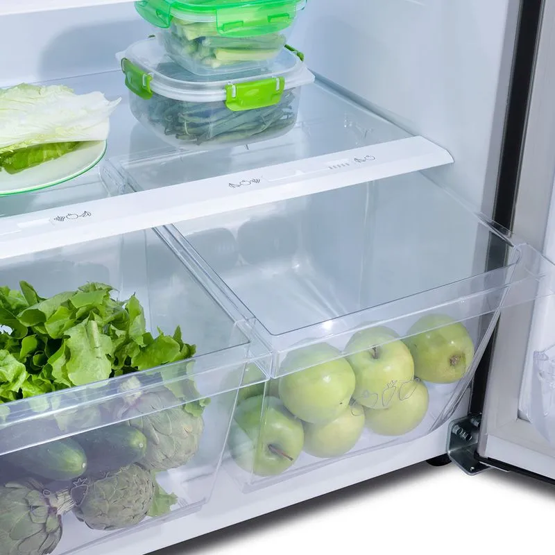 La refrigeradora 2 puertas cuenta con iluminación LED, zona fría y legumbreras transparentes tipo canasta para mantener los alimentos frescos y organizados de manera eficiente. ¡Cómprala online en Indurama!