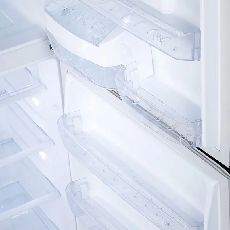 En el congelador, las bandejas regulables de vidrio templado y los balcones transparentes ofrecen una excelente organización y durabilidad, además del conveniente hielo fácil en la contrapuerta. ¡Cómoda y con una óptima distribución!