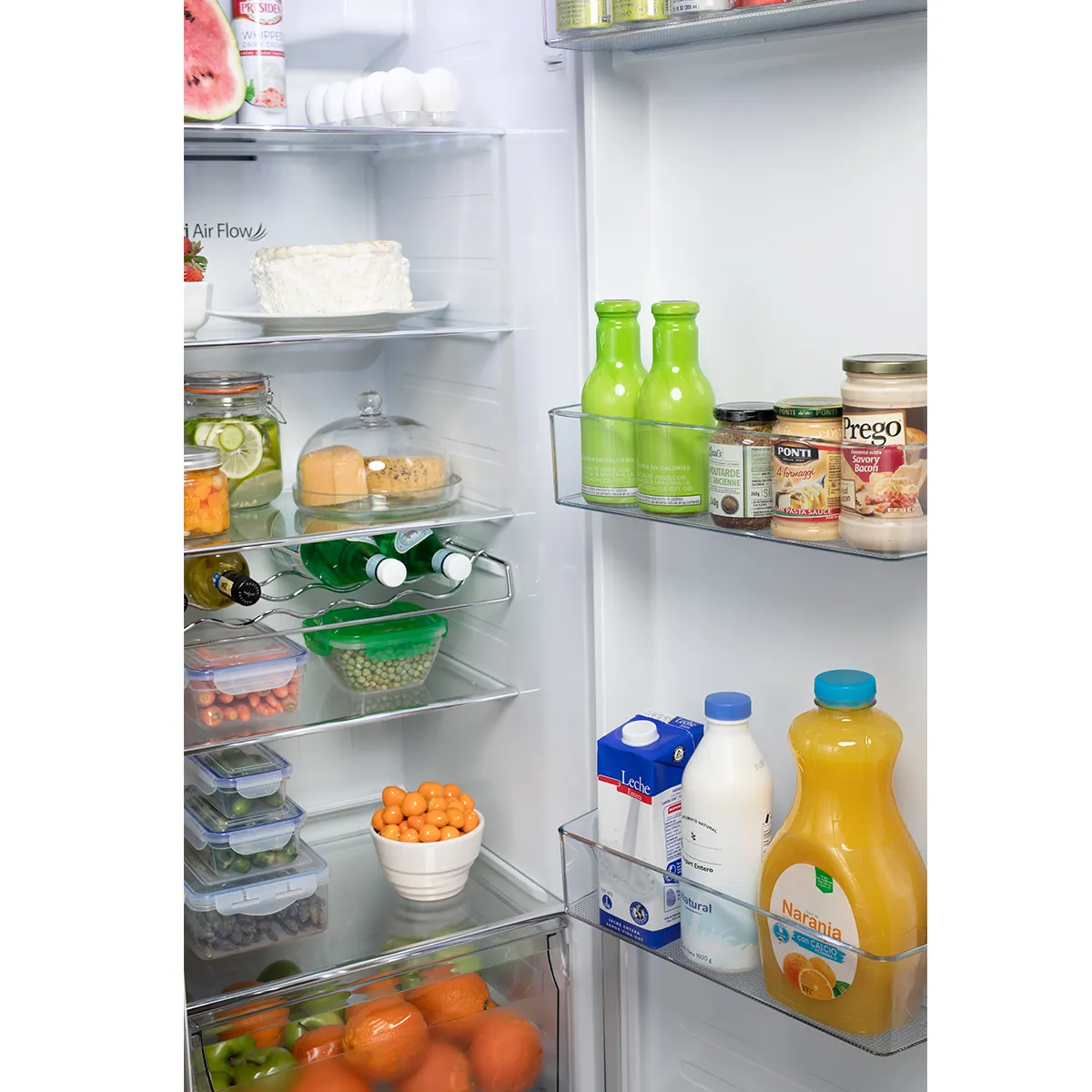 En su estructura externa destaca la lámina inoxidable anti huella, que evita marcas visibles y facilita la limpieza. Las puertas son lisas con manija frontal integrada para una estética moderna y práctica. El compartimiento refrigerador incluye bandejas modulables de vidrio templado, balcones transparentes e iluminación LED que mejora la visibilidad. En el congelador, hay balcones amplios y una bandeja ajustable para adaptarse a tus necesidades. También incluye porta huevos.