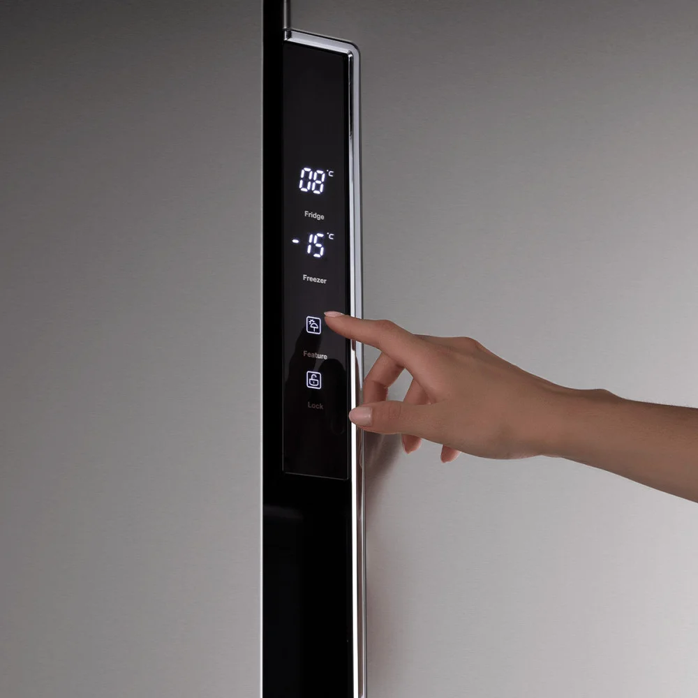 En su estructura externa destaca la lámina inoxidable anti huella, que evita marcas visibles y facilita la limpieza. Las puertas son lisas con manija frontal integrada para una estética moderna y práctica. El compartimiento refrigerador incluye bandejas modulables de vidrio templado, balcones transparentes e iluminación LED que mejora la visibilidad. En el congelador, hay balcones amplios y una bandeja ajustable para adaptarse a tus necesidades. También incluye porta huevos.